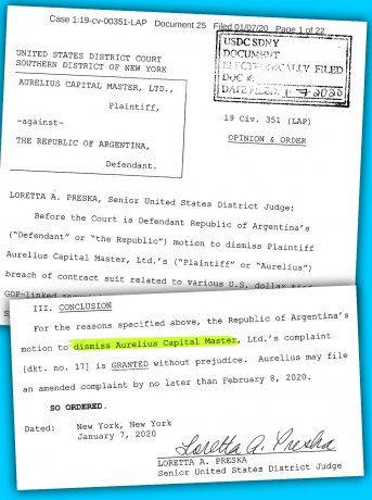 Argentina abrió ayer el año en los tribunales de Nueva York con una buena noticia. Loretta Preska desestimó la primera demanda del fondo buitre Aurelius contra el país, por el supuesto manejo de la medición del PBI en 2013 y el consecuente no pago de los dividendos del título público. Según dispuso la titular del juzgado del Segundo Distrito Sur, y que heredó el sillón de Thomas Griessa, la presentación de las pruebas de Aurelius contra el país no fueron avaladas como profundas; y, en consecuencia, desestimadas por la magistrada como fundamentos para continuar con el juicio. Preska igualmente le dio una vida más al principal demandante, y lo autorizó a hacer una nueva presentación futura para evaluar si efectivamente puede demostrar que hubo dolo en la supuesta manipulación en 2013 de los datos del PBI por parte de la Argentina. La nueva presentación será el 8 de febrero, y será la última oportunidad para el demandante para continuar con el caso.