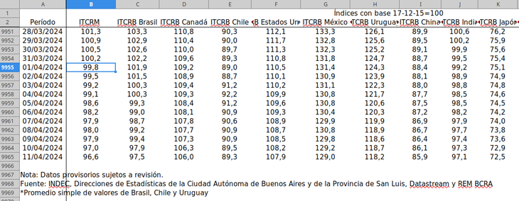 El Índice de Tipo de Cambio Real Multilateral (TCRM) que elabora diariamente el BCRA quedó por debajo de los 100 puntos, desde los 161 que tuvo en diciembre del año pasado.