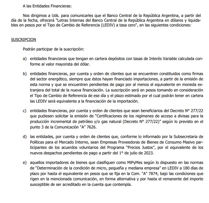 Así, esta jornada la nueva Comunicación “A” 7897 del Banco Central restringió cuáles quedaron como los únicos inversores elegibles para comprar Lediv y de esta forma reemplazó a la Comunicación “A” 7892 que había sido emitida el jueves pasado.