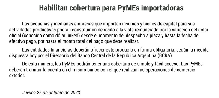 El 26 de octubre el BCRA habilitó la cobertura para PyMes importadoras. Posteriormente, el 23 de noviembre, tan solo unos días atrás, se emitió una nueva normativa con algunas modificaciones que, según operadores es la que disparó la demanda. Allí podían participar las siguientes entidades: