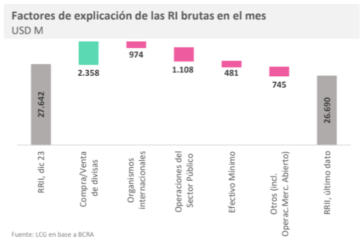 LCG y la Fundación Capital plantearon que a ese factor suma el de los pagos de deuda, que este año se acentúan respecto de 2023. Por caso, comienzan los vencimientos de capital de los bonos reestructurados (u$s1.300 millones) y crecen los intereses a saldar con los bonistas (u$s1.400 millones). Asimismo, hay pactados pagos netos al FMI por u$s2.700 millones en lo que resta del año, a menos que se acuerde el envío de fondos frescos.
