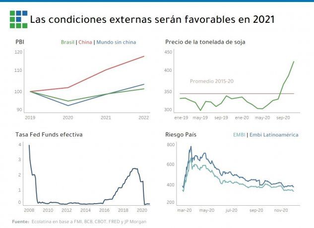 Por otra parte, la consultora señala como positivo del contexto internacional, la expectativa de que la tasa de interés de referencia internacional se mantenga cercana a cero, la promesa de un paquete fiscal significativo en la principal economía mundial en 2021 y una tendencia hacia menores restricciones a la movilidad/producción. "Si en octubre el FMI proyectaba un repunte de más de 5% de la actividad mundial, hoy hay motivos para ser incluso más optimistas: en 2021 se recobraría todo el terreno perdido producto de la pandemia (recuperación en forma de “V”)" explica Ecolatina.