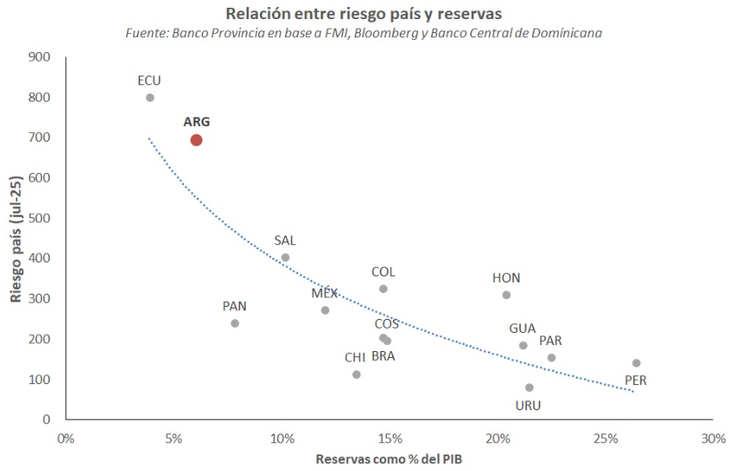 Así lo reflejó, por ejemplo, un análisis de la Gerencia de Estudios Económicos del Banco Provincia. El mismo mostró que, en la región, la correlación entre reservas y riesgo país es alta. En efecto, Bolivia, Ecuador y Argentina, las tres naciones con mayor costo de endeudamiento, son a la vez las tres que menos reservas tienen, medidas como porcentaje del Producto Bruto Interno (PBI).