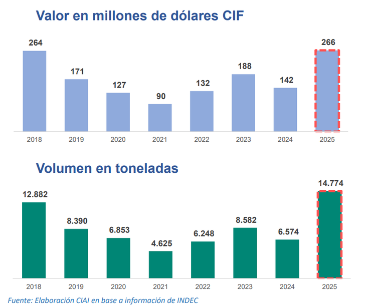 En total, se importaron 14.774 toneladas de indumentaria en los primeros cinco meses del año, marcando un salto del 125% en comparación con el mismo período de 2024. Este aumento se explica principalmente por la aceleración de compras a China, que concentró el 54% de las importaciones y cuyo precio promedio cayó un 18% interanual, abaratando la canasta general de prendas importadas.