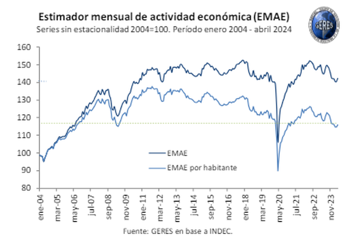 La actividad económica se encuentra en un duro proceso recesivo que afectó la demanda interna. Según una estimación del Grupo de Estudios de la Realidad Económica y Social Pablo Barousse (GERES), el PBI se retrotrajo a niveles de 2010, y en términos per cápita, a valores de 2006. En tanto, afirmó que en el acumulado de enero a mayo, el EMAE - anticipo mensual del PBI- acusó una caída del 2,9% respecto al mismo período de 2023. No obstante, si se descuenta el aporte del sector agropecuario, que creció 47,1% interanual (i.a.), el EMAE sin agro se desplomó 5,9% i.a.