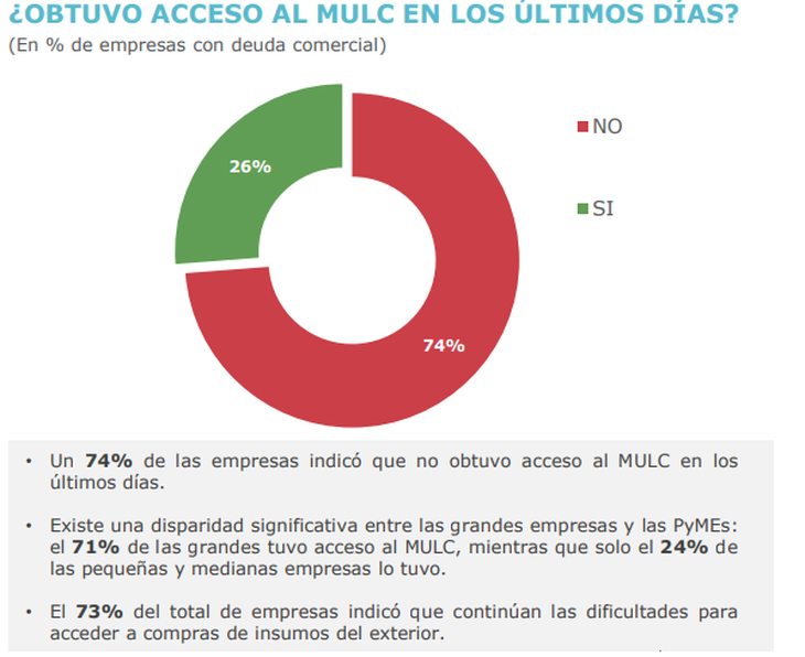 En febrero, un 74% de las empresas indicó que había obtenido acceso al MULC, pero con una gran disparidad entre las grandes empresas y las PyMEs porque el 71% de las primeras tuvo acceso al MULC, mientras que solo el 24% de las segundas.