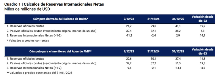 Lo cierto es que el propio reporte exhibe la fragilidad con la que llegaron las reservas internacionales netas a fines del año pasado y lo lejos que quedaron de la meta comprometida con el Fondo Monetario Internacional, lo que llevará a negociar un waiver por incumplimiento durante la revisión prevista para febrero. En un cuadro incluido en el documento, el BCRA informa que al 31 de diciembre de 2025 el cómputo de reservas netas derivado del balance de la entidad se ubicaba en u$s2.900 millones, pero que el medido con la metodología definida por el FMI para monitorear el acuerdo se encontraban en u$s14.100 millones negativas.