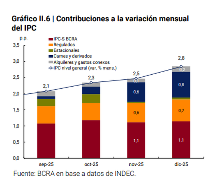 "Entre los factores de riesgo se puede mencionar: primero, la estacionalidad del agrupado Carnes y derivados en el período noviembre-marzo que puede afectar la categoría Núcleo del IPC; un segundo riesgo transitorio lo constituye la corrección prevista en las tarifas residenciales de electricidad y gas por la readecuación del esquema de subsidios, con impacto en la categoría Regulados; y por último, en marzo suelen incidir significativamente los aumentos en el agrupado Educación (Regulados) y en Prendas de vestir (Estacionales), en este último caso asociado al cambio de temporada para la ropa", argumentó el BCRA.