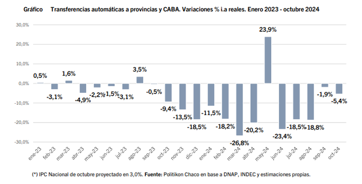 Según estimó Politikon Chaco, “calculado a precios actuales, esta contracción generó pérdidas de recursos para el consolidado de provincias y CABA por $235.363 millones respecto a octubre 2023”.
