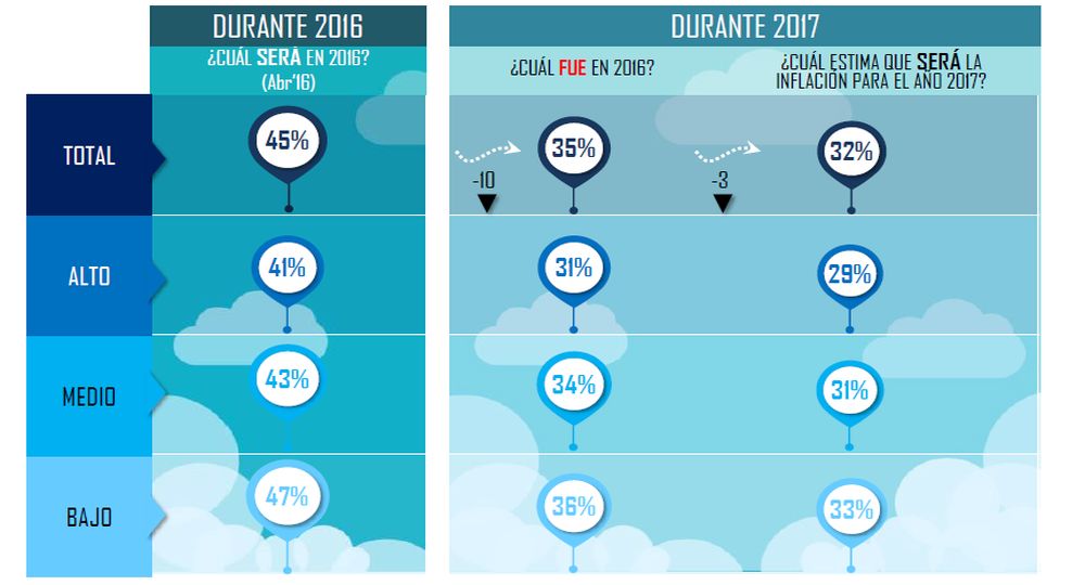 De acuerdo al informe, los compradores consideran que la inflación comenzó una tendencia a la baja y que se ubicará en torno al 32% (-3% con relación a un año antes) durante 2017.