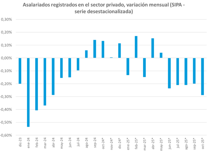 El informe de Trabajo, que surge a partir de los datos del Sistema Integrado Previsional Argentino (SIPA), también publicó datos desalentadores sobre salarios, ya que en octubre se verificó la segunda caída real al hilo en el sector privado formal. Más aún, si se toma el promedio de los salarios negociados en paritarias durante noviembre, puede adelantarse una nueva merma en el poder adquisitivo.