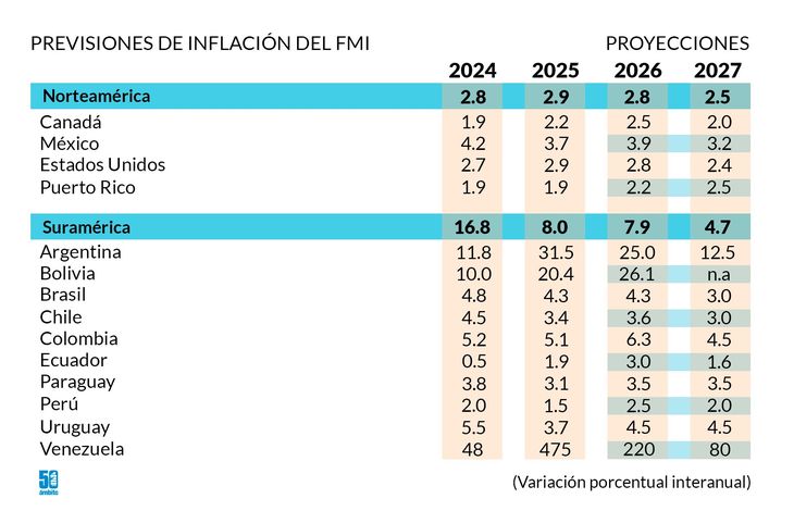 La economía argentina también se ubica entre las que registrarían la mayor tasa de inflación en 2026, según el FMI. Se proyecta un aumento de los precios de 25%, el tercer registro más alto del sur de América después de Venezuela -220%- y Bolivia – 26,1%-.