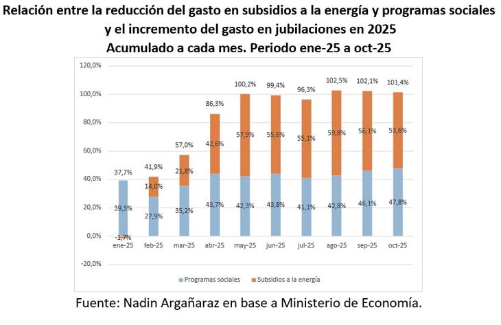 El estudio aclaró que “debido al cambio de la formula jubilatoria de 2024, el gasto con mayor incremento real en términos monetarios en 2025 fue el gasto en jubilaciones y pensiones contributivas”. Por otro lado, agregaron, "los gastos que mayor descenso monetario real presentaron fueron el gasto en subsidios a la energía y el gasto en programas sociales”.