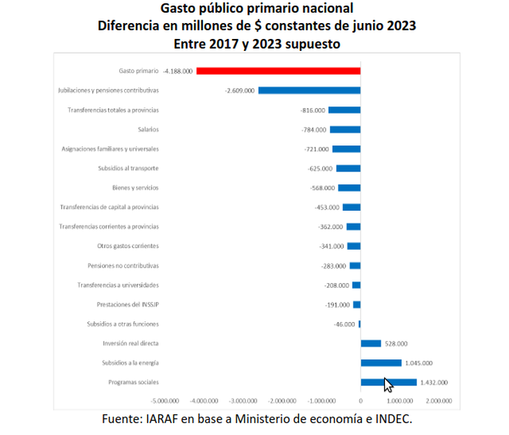 De 15 componentes que mide el IARAF, 12 tienen una caída del 22% real y 3 tienen una suba de 109%. Los que caen son: subsidios al transporte (45,8%), otros gastos (38,8%), bienes y servicios (36,1%), transferencias de capital a provincias (34,2%); asignaciones familiares (33,6), transferencias a provincias (31,9%), subsidios a otras funciones (31,9%), transferencias corrientes a provincias (29,5%), jubilaciones y pensiones (18,8%), pensiones no contributivas (18,6%), transferencias a universidades (16,3%), salarios (15,6%), y prestaciones del INSSIP (12,5%). En cambio, los componentes que suben son: inversión real directa (28,7%), subsidios a la energía (56,3%) y programas sociales (244,8%).