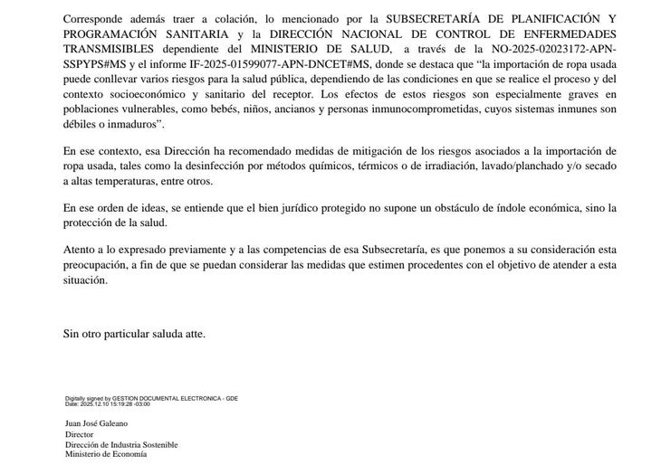 Según consta en el comunicado oficial, el requerimiento para endurecer los controles partió de la Subsecretaría de Comercio Exterior, pero anteriormente hubo una advertencia del Ministerio de Salud. “La importación de ropa usada puede conllevar riesgos para la salud pública”, dice el documento al que accedió este medio. En ese sentido, la evaluación indicó que “los efectos son especialmente graves en poblaciones vulnerables, como bebés, niños, ancianos y personas inmunocomprometidas”.