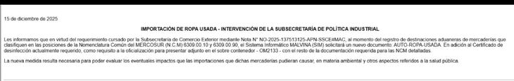Ámbito reveló a finales de noviembre que los montos de importación de ropa usada se multiplicaron por cuarenta en los primeros ocho meses de 2025, con respecto a todo 2024. Luego de la publicación, un grupo de cámaras empresariales del sector textil e indumentaria elevó reclamos a la Secretaría de Coordinación de Producción que conduce Pablo Lavigne para que revise la cuestión.