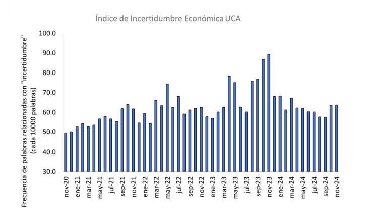 El valor del índice en el mes de noviembre fue 63,7, según la medición del Centro de Analítica Económica y Empresarial de la Universidad Católica Argentina (UCA). Es decir, en promedio, por cada 10.000 palabras en mensajes económicos, se detectaron 63,7 palabras vinculadas a incertidumbre.