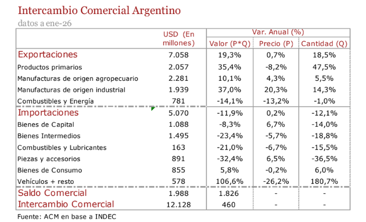 Argentina registró un superávit comercial de u$s1.987 millones en el primer mes del año, cifra que triplicó las expectativas del mercado. Esta mejora responde a un efecto combinado: por un lado, el impulso de las exportaciones de trigo y manufacturas industriales; por otro, una nueva caída mensual en las importaciones. Este último descenso se concentró en bienes de capital, aquellos vinculados a las inversiones, y en bienes de consumo, afectados por el elevado stock remanente tras el auge de compras previo a las elecciones legislativas.