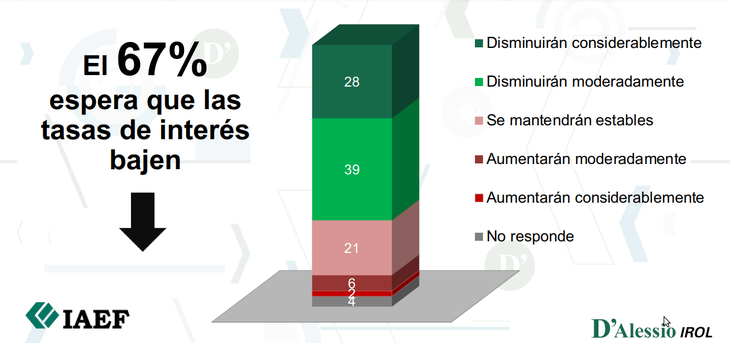 El estudio dice que el 67% de los consultados espera que el BCRA siga bajando el costo del dinero. Un 28% cree que las tasas van a disminuir considerablemente, el 39% que bajarán moderadamente, en tanto que un 21% dice que se van a mantener estables.