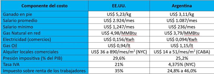 Como se puede apreciar en la tabla los costos en Argentina resultan muy inferiores a los vigentes en EE.UU., en especial en el precio de la carne, principal materia prima del Big Mac (40,5% más bajo), en los salarios (62,7% a 82,1% abajo), en el gas natural y la electricidad (24,1% y 39,7%, respectivamente) y en los alquileres de locales comerciales (entre 61,1 y 94,3% abajo); con excepciones en el precio del gasoil (22,3% arriba) y en la presión impositiva, en este último caso muy superior a la Argentina, aunque en una magnitud que no permite explicar la diferencia de los precios de venta entre ambos países.