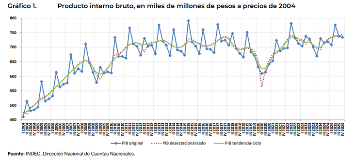 De acuerdo con los datos del INDEC, en el último trimestre de 2025 el PBI fue 2,1% superior al del mismo período de 2024. Esto significó la segunda desaceleración consecutiva del crecimiento en términos interanuales.