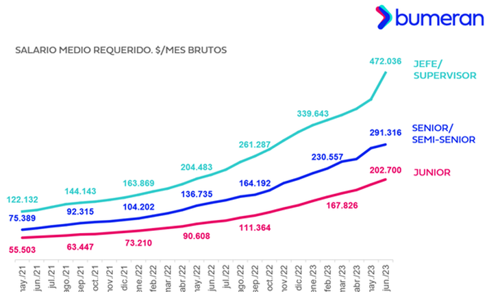 Según el seniority del puesto, el sueldo promedio de las posiciones de jefe y supervisor alcanzó los $472.036 pesos por mes, con un aumento de 16,4% respecto al mes anterior, en las categorías senior y semi senior los 291.316 pesos por mes, con un incremento de 3,4%, y en los niveles junior los 202.700 pesos por mes con una suba del 4,6%.