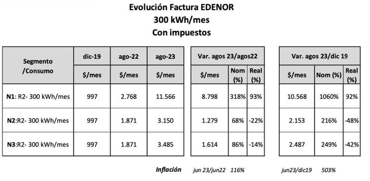 En el mismo período, la inflación superó el 100%, por lo que en términos reales la suba fue del 93% para los N1, pero casi el 70% de los usuarios tuvo aumentos menores a la inflación, difundió Royón en sus redes sociales. En un ejemplo de una factura de Edenor de un consumo de 300 kWh/mes, los N3 tuvieron una variación real del -14%, y los N3 del -22%. “Si bien puede haber facturas con tarifas altas respecto a septiembre 2022, el común de los hogares comprendido en N2 y N3 no presenta aumentos semejantes en sus facturas”, informó Royón, y compartió el registro de acceso a los subsidios a la energía (RASE) que sigue abierto.