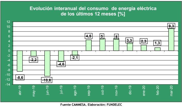 La Fundación para el Desarrollo Eléctrico (Fundelec) informó que en marzo aumentó 9,3% interanual la demanda total de electricidad, en un mes signado por el comienzo de la vigencia de la cuarentena por el coronavirus y con temperaturas que marcaron un récord histórico (Marzo de 2020 fue el mes más caluroso de la historia con un promedio de 24.4 °C).