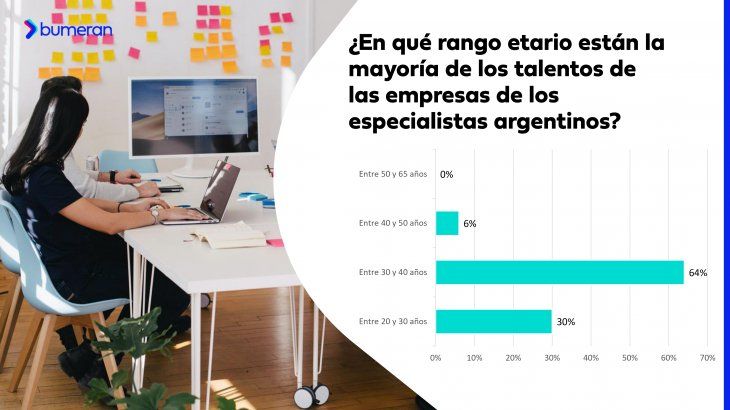 El 64% de los profesionales en HR argentinos asegura que la mayoría de los talentos de su empresa tienen entre 30 y 40 años, el 30% dice que la mayoría son personas de entre 20 y 30 años, el 6% tiene mayoría de personas en su empresa de entre 40 y 50 años y ningún especialista respondió por la franja etaria de entre 50 y 65 años.