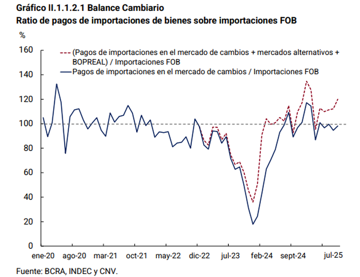 Moldovan agregó que incluso el propio BCRA reconoce este tipo de maniobras al plasmar en su informe que "en julio los importadores habrían cancelado obligaciones por importaciones por u$s1.400 millones a través de mercados alternativos al oficial y Bopreales".