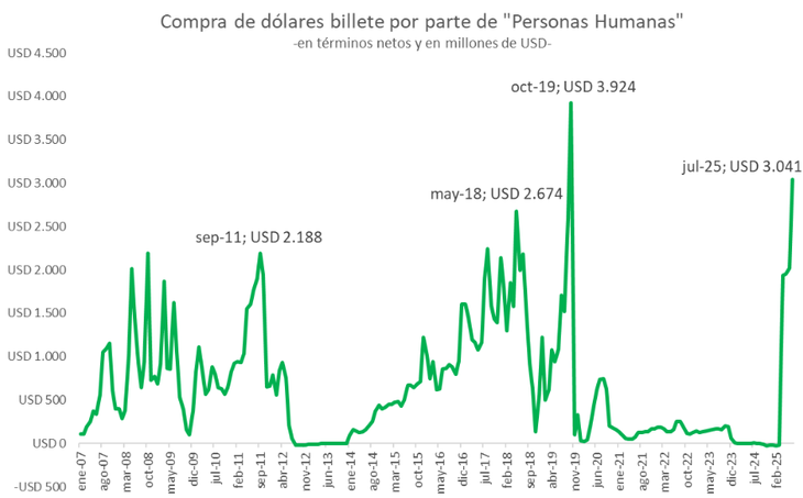 Tal como remarcó Ámbito, a partir de un informe publicado la semana pasada por el Banco Central (BCRA), en julio la compra neta de dólar "billete" alcanzó unos u$s3.041 millones. Desde que la autoridad monetaria tiene registros (enero de 2007), esta cifra solo fue superada por el dato de octubre de 2019, previo a la imposición del cepo de u$s200 por parte del gobierno de Mauricio Macri.
