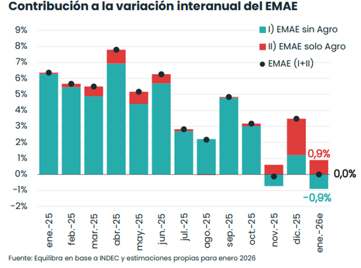 Hacia adelante, Equilibra remarcó que el EMAE anticipa un arrastre estadístico positivo de 0,8% para este año, por lo cual "si la economía sostiene el nivel de actividad alcanzado en el último cuarto del año pasado, el Producto Bruto Interno crecería 0,8% en 2026".