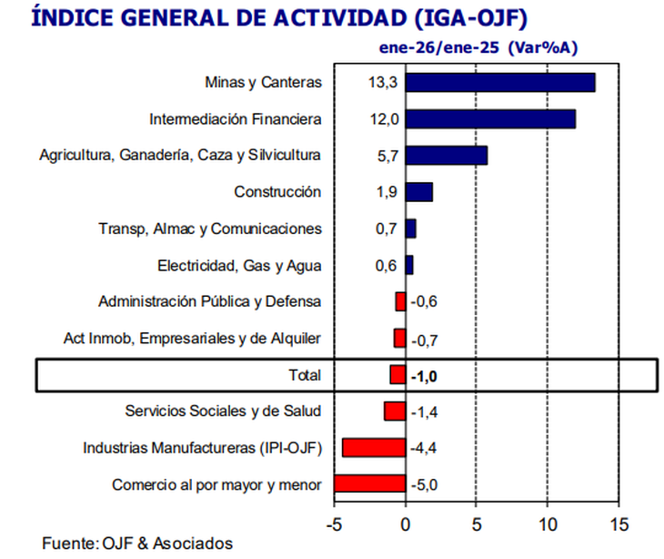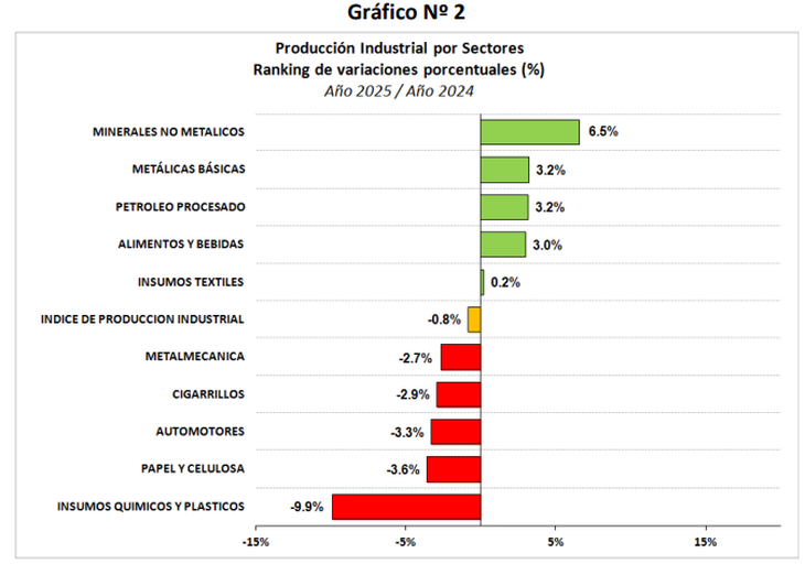 En comparación con enero de 2025, subrayó una mejora del 4% en la producción de bienes de consumo no durable, impulsada por el rubro de alimentos. Por el contrario, la fabricación de bienes intermedios retrocedió 3,5%, arrastrada por insumos de la construcción, textiles, químicos y plásticos, y papel. Mientras tanto, la producción de bienes de capital y de bienes de consumo durable se derrumbaron 15,5% y 21,3%, respectivamente.