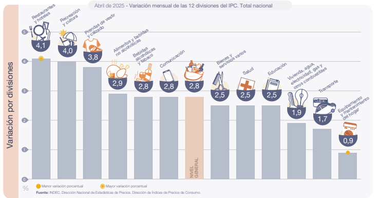 Según informó el INDEC este miércoles, dentro de las divisiones con mayor relevancia en el Índice de Precios al Consumidor (IPC), los principales aumentos se vieron en Restaurantes y hoteles (+4,1%), Prendas de vestir y calzado (+3,8%) y Alimentos y bebidas no alcohólicas (+2,9%).