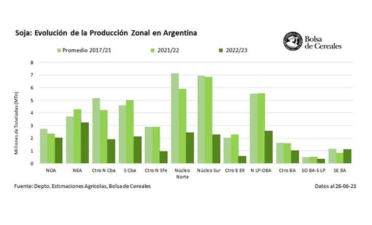 Por efecto de la sequía que afectó al campo el año pasado y princiíos de este, la producción de soja se ubicó un 51,5% por debajo de lo registrado en el ciclo anterior, con una merma interanual de unas 22,3 millones de toneladas, indicó la Bolsa de Cereales de Buenos Aires (BCBA). Fue también la peor desde que la entidad bursátil empezó sus registros en el año 2000. El desplome de los rindes alcanzó el 45%, llegando a los peores niveles en 10 años, con apenas 15,4 quintales por hectárea (qq/ha).