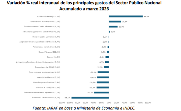 Según indica el Instituto Argentino de Análisis Fiscal (IARAF), al analizar lo sucedido en el primer trimestre de 2026 con relación al mismo período de 2025, surge que "los ingresos totales tuvieron una variación real interanual negativa de 5,1%".