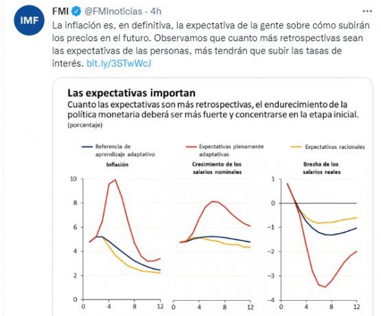 “La inflación es, en definitiva, la expectativa de la gente sobre cómo subirán los precios en el futuro. Observamos que cuanto más retrospectivas sean las expectativas de las personas, más tendrán que subir las tasas de interés”, afirmó este martes el Fondo Monetario Internacional (FMI) en su último informe de análisis y proyecciones de la economía mundial.