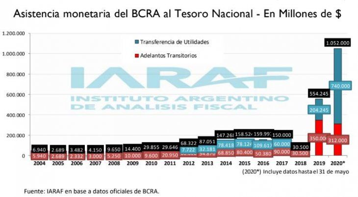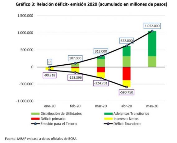 De acuerdo a un informe del Instituto Argentino de Análisis Fiscal (IARAF), la emisión monetaria del Banco Central (BCRA) para asistir al Tesoro durante los primeros cinco meses de 2020 representa el 3,5% del PBI estimado para este año y se convirtió en la cifra más alta de los últimos 30 años.