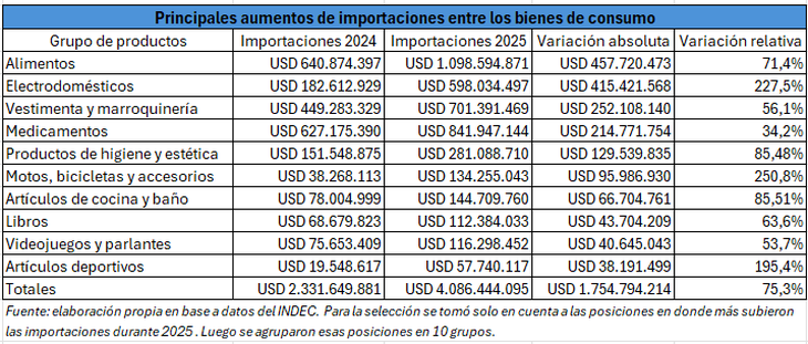 Tomando como punto de partida los datos del INDEC, y el Nomenclador Común del Mercosur, este medio construyó un relevamiento propio para identificar la composición de los 50 bienes de consumo donde más subieron las compras externas entre 2024 y 2025.