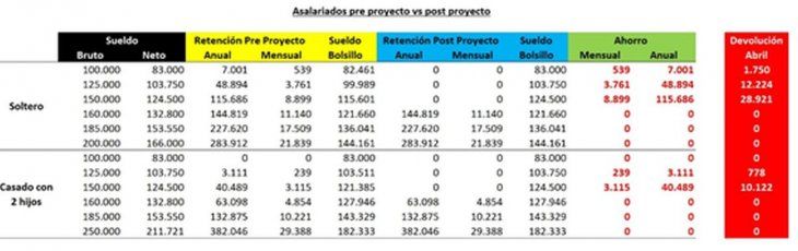 A continuación, se analiza un cuadro con diferentes sueldos que compara como impactará la modificación introducida por el proyecto.
