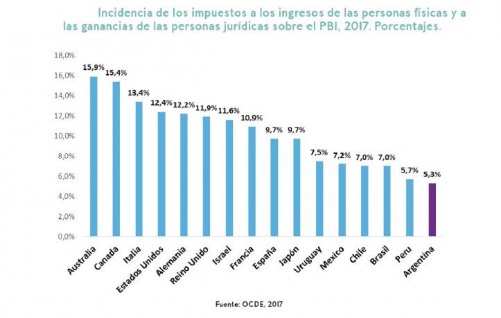 En cuanto al impuesto a la riqueza impulsado en la Argentina por el Frente de Todos, CEPA analiza la presión fiscal en la Argentina. “Si tomamos la comparación internacional que realiza la OCDE (Organización para la Cooperación y el Desarrollo Económico) a 2017, Argentina es uno de los países que menor gravamen realiza a los que mayores ingresos tienen. La OCDE estima cuánto pesan los impuestos a los ingresos sobre las personas y a las ganancias sobre las empresas, sobre el PBI. Son impuestos progresivos y sobre flujos pagan más los que más ingresos tienen (están excluidos, no obstante, los impuestos patrimoniales). En la Argentina a 2017 estos impuestos pesan 5,3%, mientras que en países como Brasil o Chile pesan 7%. En Francia 10,9%, Israel 11,6%, Alemania 12,2%, Estados Unidos 12,4%, Italia 13,4%, Canadá 15,4%, Australia 15,9%”, afirma.