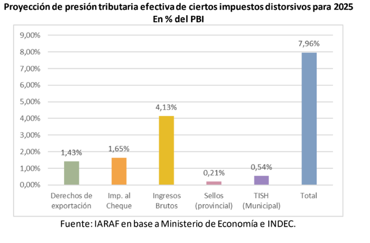 De acuerdo con datos del IARAF, la presión fiscal de los tres niveles Nación, provincias y municipios, se ubicó en 2024 en el orden del 30,5%, medida como la relación entre recaudación respecto del PBI.