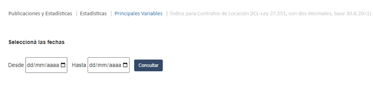El usuario deberá seleccionar las fechas de inicio y finalización del período que se quiere consultar. Primero se debe colocar la fecha en la que se firmó el contrato, para saber cuál era el índice en ese momento, y en la que se hará el ajuste.