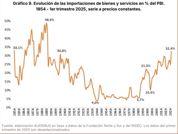 Las importaciones siguen creciendo, en junio las cantidades subieron más de un 53%, lo hicieron por el rebote de la actividad económica, pero también por los incentivos del modelo: apreciación cambiaria y apertura comercial. De hecho la participación de las importaciones de bienes y servicios sobre el producto bruto interno alcanzó el 32,4%, su punto más alto en el último siglo, según datos de la consultora Audemus.