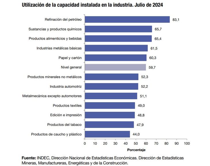 La industria manufacturera utilizó el 59,7% de la capacidad instalada en julio, unos 5,2 puntos porcentuales (p.p.) arriba del mes previo, según informó el Instituto Nacional de Estadísticas y Censos (INDEC). Sin embargo, cayó 5,3 p.p. frente al mismo mes del año previo, cuando el uso fue del 65%.