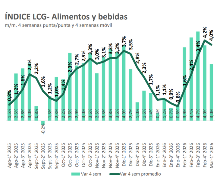 Por su parte, la consultora Labour Capital & Growth (LCG), que mide la variación de los alimentos, observó una desaceleración semanal de los precios, respecto al mismo período de febrero. Aunque advirtió que la inflación mensual promedio aún se ubica en torno al 4%, cerca de un máximo de 20 meses. La última vez que superó ese umbral fue en julio de 2024, cuando marcó 4,2%, nivel similar al que acumulaba hasta la última semana de febrero.