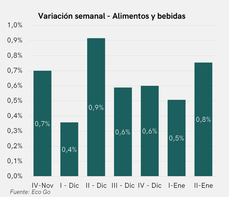 De acuerdo con el relevamiento de LCG, en la segunda semana de enero el rubro Alimentos y Bebidas registró una suba del 0,5% semanal, con una inflación promedio mensual de las últimas cuatro semanas cercana al 1,1%.