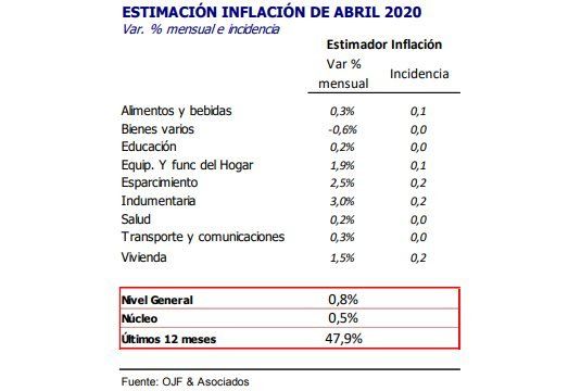 El Centro de Estudios Económicos de Orlando J. Ferreres publicó el IPC-OJF (GBA) que recoge datos de plena cuarentena, mostrando que la inflación de abril fue de 0,8% mensual, registrando un crecimiento interanual de 47,9%.