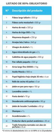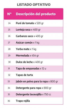 La canasta está compuesta por: arroz, fideos cortos y largos, aceite, harinas de trigo y maíz, mayonesa, vinagre, arvejas, agua mineralizada, galletitas de agua, pan rallado, papel higiénico, papel de rollo de cocina, lavandina, jabón de tocador, jabón para la ropa, pasta dental, desodorante antitranspirante, shampoo, acondicionador, protectores diarios y toallas femeninas. Entre los productos optativos que ahora se incorporan al acuerdo, hay tapas para empanadas, tapas para tarta, detergente, trapo rejilla, dulce de leche, mermelada, yerba, jabón en polvo, garbanzos secos, lentejas secas y puré de tomates, entre otros.