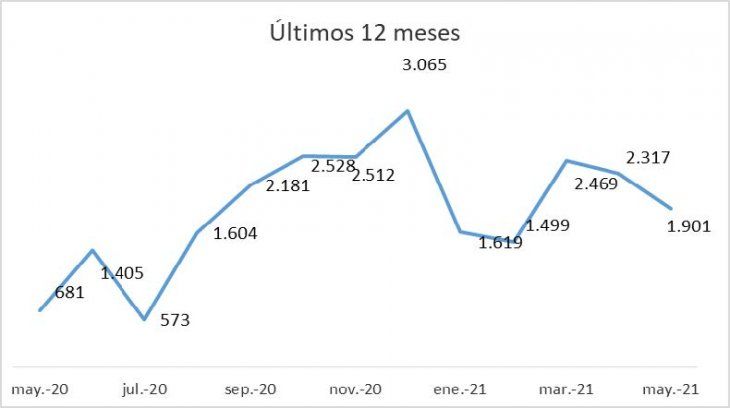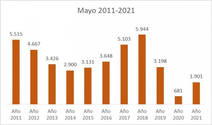 En mayo de 2021, se realizaron 1901 escrituras de compraventa, con un monto involucrado de $15.619 millones. El monto medio de las operaciones fue de $8.216.583, equivalente a u$s82.512.